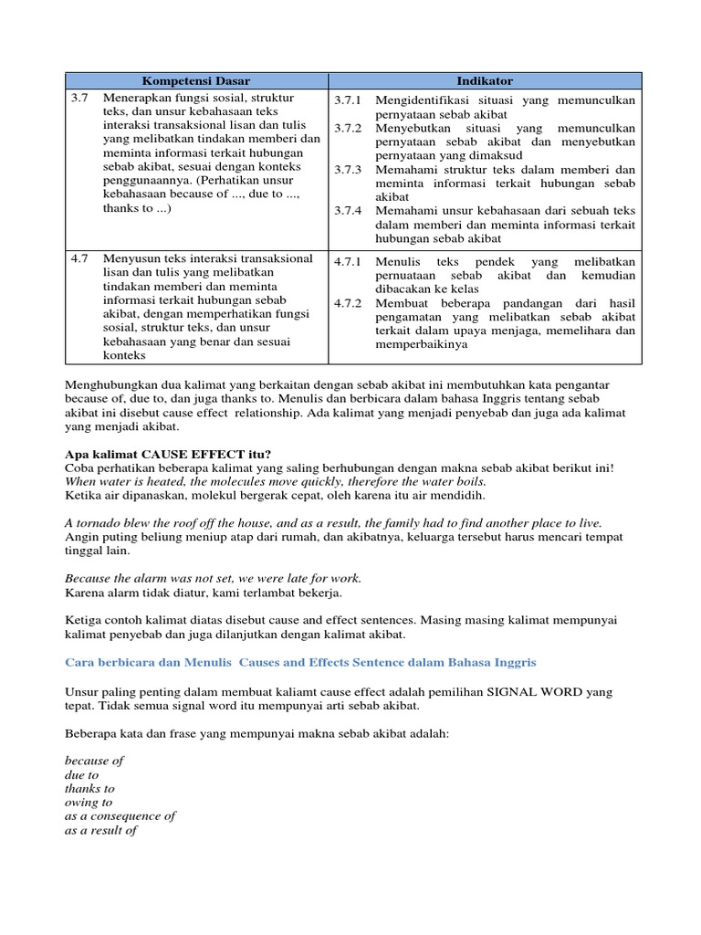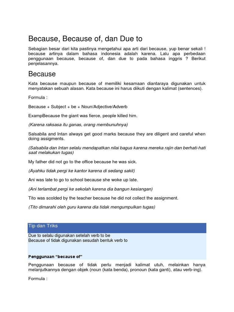 Clause ini sering diletakkan diawal kalimat. Penggunaan kata because dan because of ternyata sangat berbeda. Keduanya dihubungkan oleh conjunction (kata sambung). Good style dictates that there should be no comma between these two clauses. Menggunakan kalimat because of, owing to,due to, thank god,thank to. Coordinating conjunction, digunakan untuk menggabungkan dua macam kalimat yang sama secara. Sedangkan kalimat kedua merupakan kalimat yang menunjukkan hasil dari suatu kejadian. Kata because harus diikuti kalimat. Induk kalimat menyatakan sebab, dan anak kalimat menyatakan akibat; Klausa because tidak dapat berdiri klausa because bisa berada di awal maupun di akhir kalimat. Because because digunakan untuk menggabungkan dua klausa yang menunjukkan adanya sebab. Secara sederhana, cause and effect adalah kalimat sebab dan akibat. Sedangkan because of setelah kata ini tidak boleh memasukkan kalimat atau subjek dan verb.