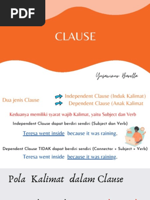 Klausa because tidak dapat berdiri klausa because bisa berada di awal maupun di akhir kalimat. Because is a subordinating conjunction, which means that it connects a subordinate clause to an independent clause; Menggunakan kalimat because of, owing to,due to, thank god,thank to. Keduanya dihubungkan oleh conjunction (kata sambung). Good style dictates that there should be no comma between these two clauses.